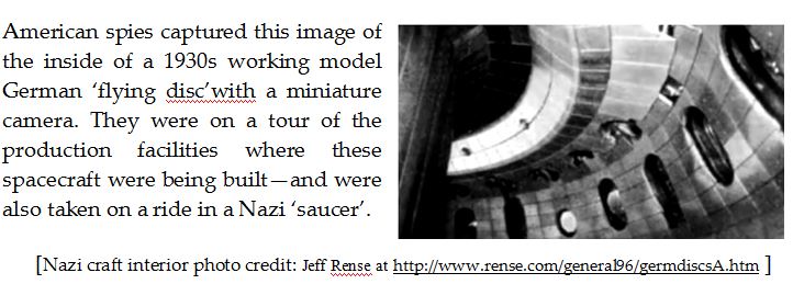 Meanwhile, the war ended in Europe and the Allies began to look over the spoils of war the Nazis left behind and took note of all the evidence of work being done on highly advanced, exotic spacecraft that Naval Intelligence was fully aware of from spy work.
