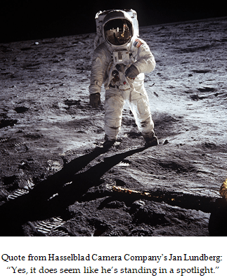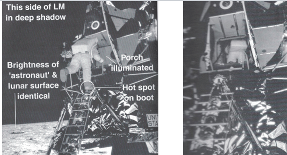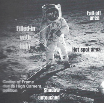 “None of the Apollo flights could carry lighting equipment,” Mr. Percy states, “however, in the picture on left, ‘Aldrin’ emerges on the shadow side of the LEM in images supported with ‘soft’ lighting”. This type of lighting was just coming into wider use in common photography.